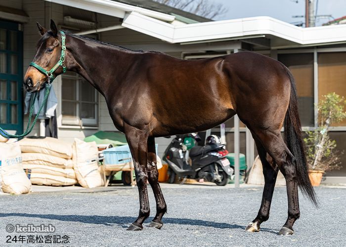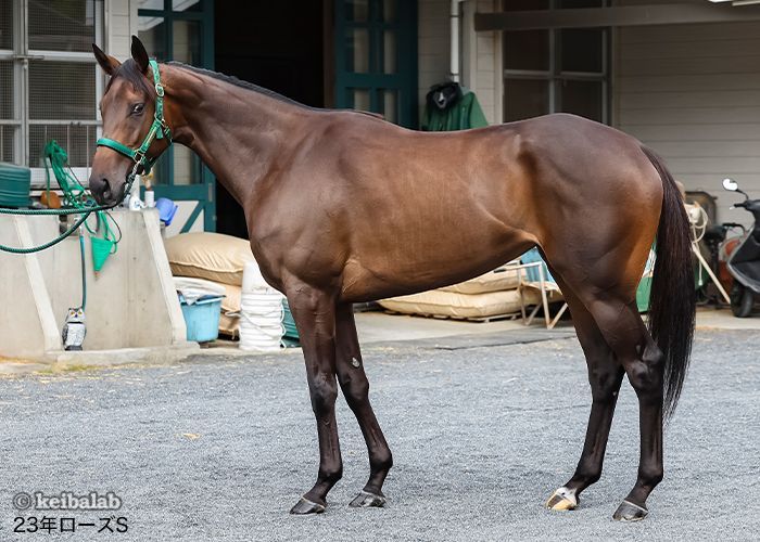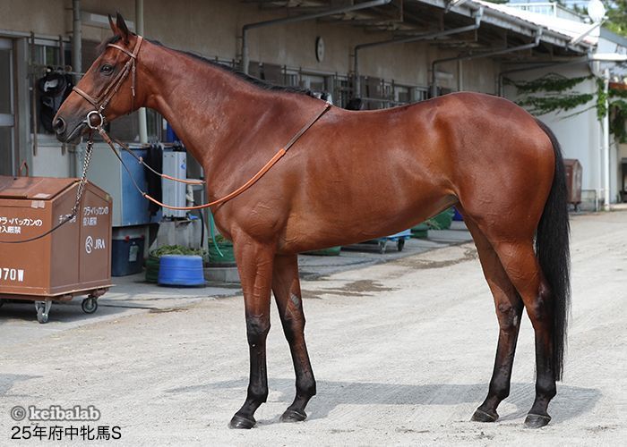 コンパクトな馬だが付くべきところにしっかりと筋肉が付いている。父譲りで胸前から肩周りはたくましく、前輪駆動的な力強いフットワークが特徴的。タフな馬場状態は得意そう。バランスがやや前重心のためスピードの乗りが良い。以前はボリューム感がある立ち姿ゆえに短距離志向の強さを感じたが、現在は体重が増えているのに馬体はスッキリと見せる。これが距離克服の一因か。勝利を収めた前走時といい意味で変わらない体つき。間隔は開いたが十分に力は出せるはず。